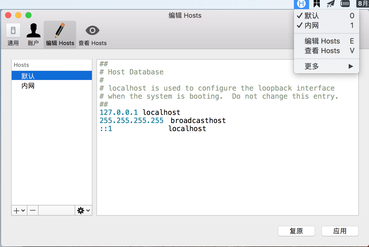 内网还分两套测试环境,这就涉及反复调整 hosts。所以,我也就找了些能管理 hosts 的软件。