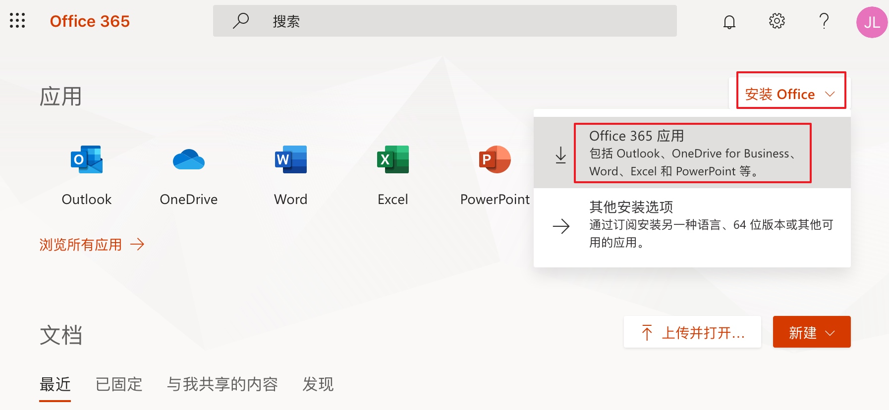 打开页面后,点击右上角“安装Office”-“Office 365应用”,就可以完成下载了。